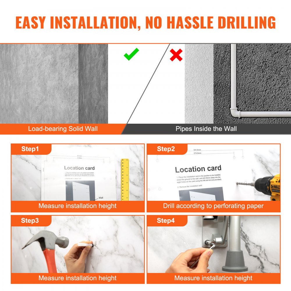 Montaż ścienny z otworem: Starannie wyposażony w naklejkę z oznaczeniem otworu montażowego, umożliwiającą precyzyjne wiercenie – bez konieczności dodatkowego znakowania długopisem. W komplecie ze śrubami ze stali nierdzewnej 304 i innymi akcesoriami, zapewniającymi bezpieczny montaż. Uwaga: Zamontuj nasze składane siedzisko prysznicowe na nośnych ścianach litych.