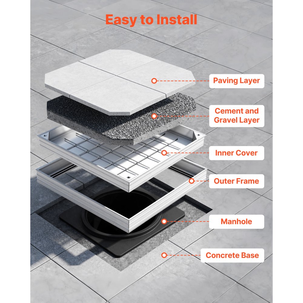 Pokrywa włazu VEVOR z ramą 50 x 50 cm, niewidoczna pokrywa włazu, brukowana pokrywa szamba ze stopu aluminium do zintegrowanego kanału odwadniającego na ścieżkach w ogrodach i tarasach - Instalacja wodociągowa | Galaxy Sklep