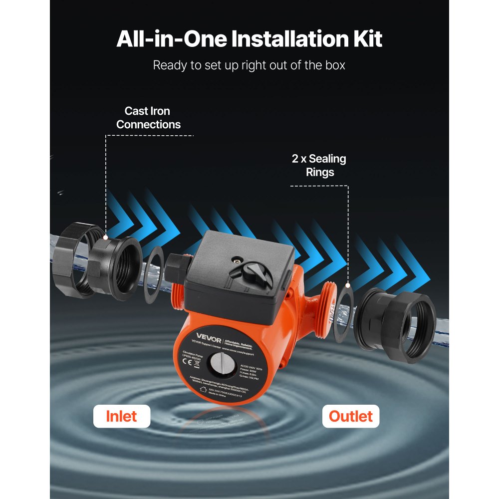 Wysoka wydajność: Dzięki trzem prędkościom pracy pompa obiegowa pozwala na dostosowanie przepływu do potrzeb użytkownika. Maksymalny przepływ: 14,53 GPM/55 LPM, wysokość podnoszenia 19,69 ft/6 m i moc 1/8 KM. Znacznie poprawia to wydajność obiegu ciepłej wody, zapewniając szybkie podgrzewanie.