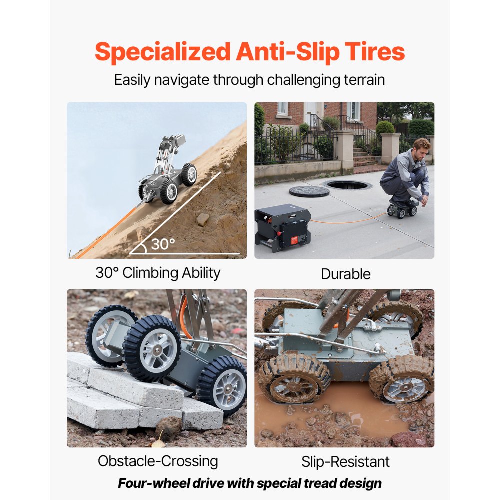 Bezproblemowa nawigacja po skomplikowanych rurach: Robot do inspekcji rur kanalizacyjnych VEVOR jest napędzany wysoce wydajnymi bezszczotkowymi silnikami prądu stałego i wyposażony w napęd na wszystkie koła, co ułatwia pokonywanie rur o nachyleniu 30°. Posiada trzy ustawienia prędkości i opony antypoślizgowe, które zapewniają stabilną przyczepność nawet w trudnym terenie.