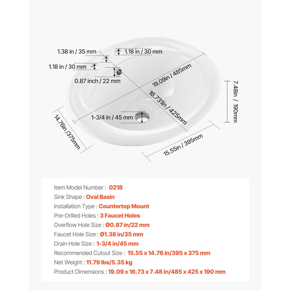 Umywalka VEVOR półwpuszczana w blat, owalna, 485 x 425 mm, z przelewem i 3 otworami na baterię, nowoczesna umywalka do zabudowy w małych pomieszczeniach, kuchniach i łazienkach, biała - Instalacja wodociągowa | Galaxy Sklep