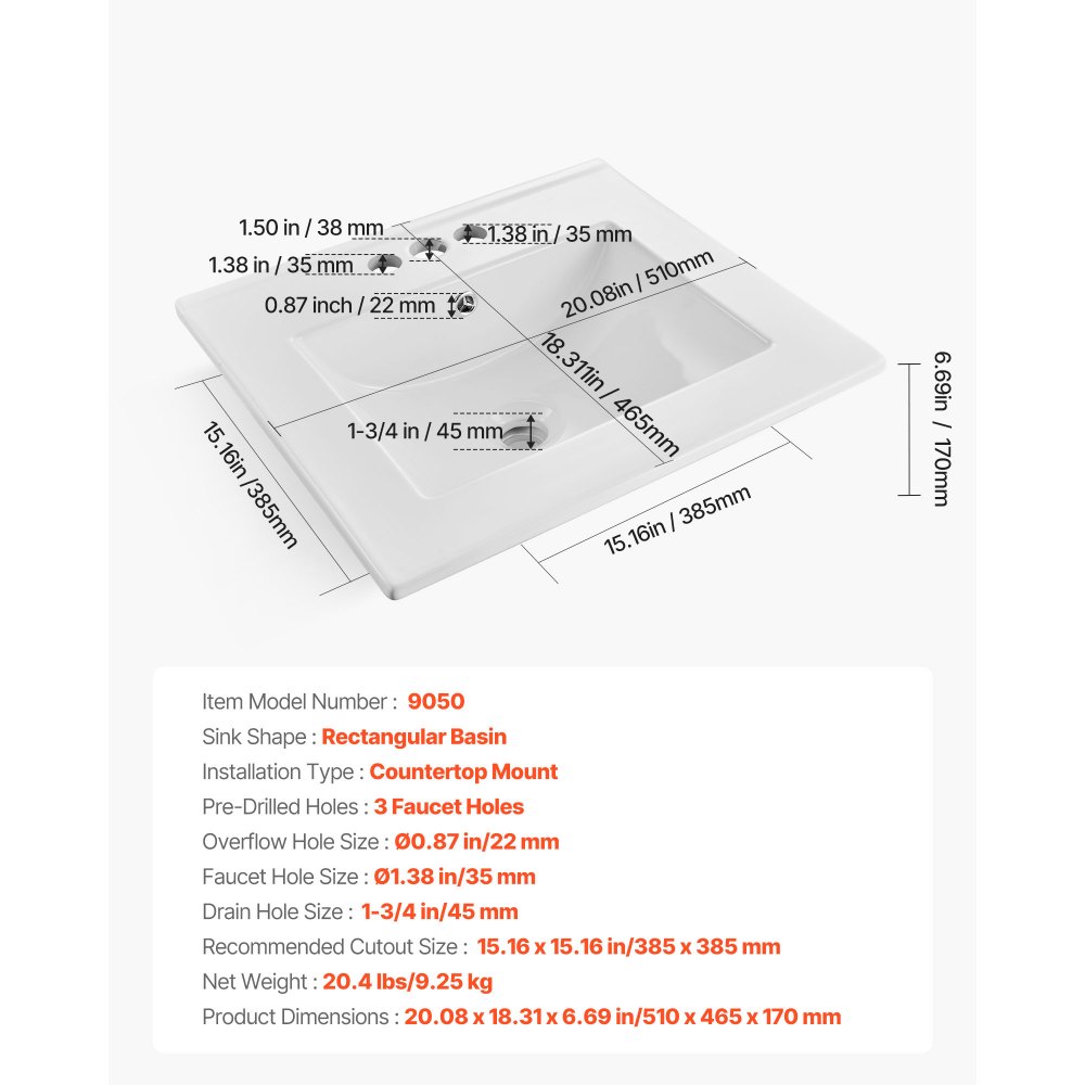 Montaż na blacie: Nasza półwpuszczana umywalka łazienkowa o wymiarach 510 x 465 x 170 mm (20,08 x 18,31 x 6,69 cala) posiada odpływ o średnicy 1-3/4 cala (1-3/4 cala) i trzy wstępnie wywiercone otwory na baterię. Zalecany otwór w szafce to 385 x 385 mm (15,16 x 15,16 cala). Pasuje do łazienek w domu, hotelu i apartamencie (bateria i odpływ nie są dołączone).