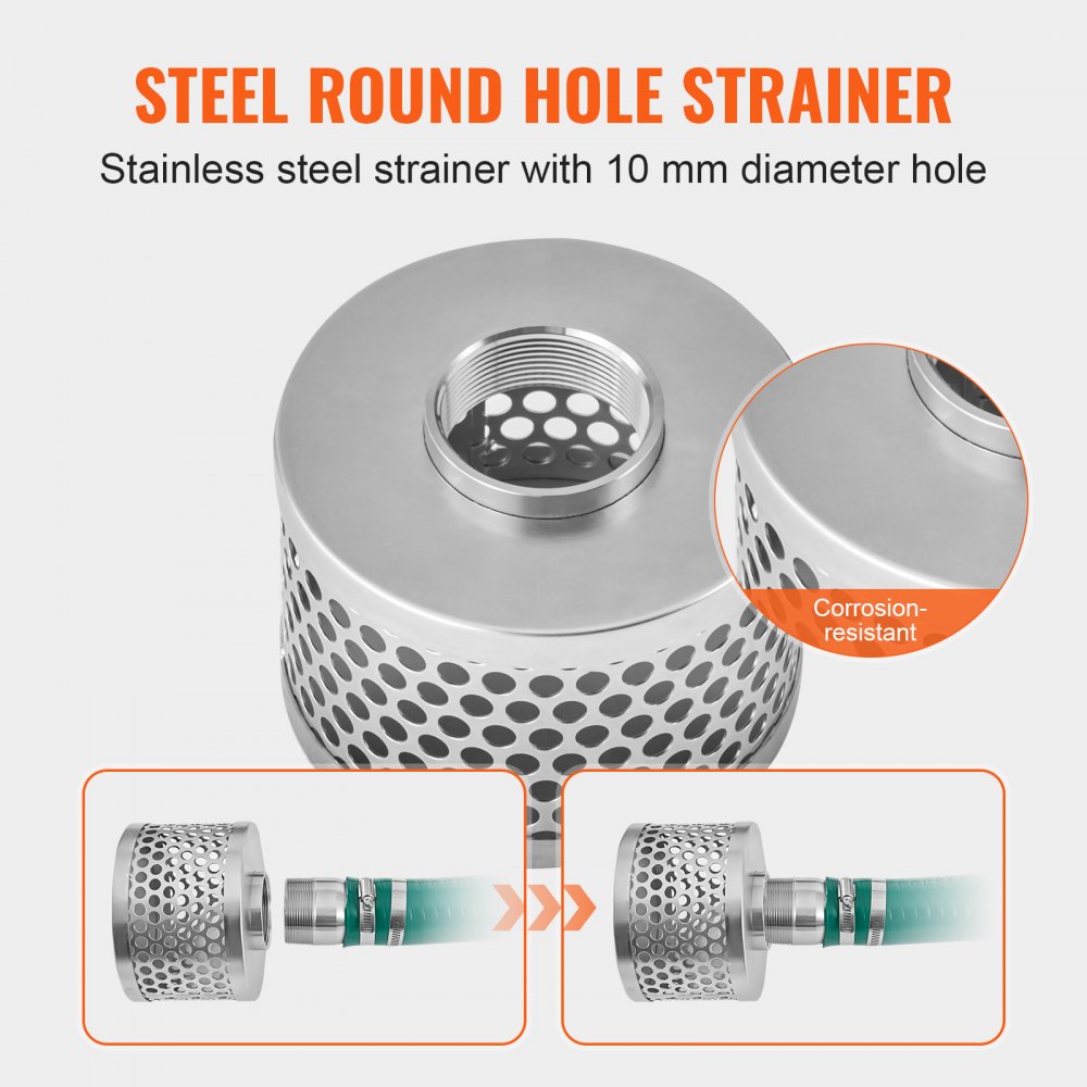 Wyjątkowa wszechstronność: Okrągły, perforowany filtr ze stali nierdzewnej posiada otwór o średnicy 10 mm, co zapewnia odporność na rdzę i korozję oraz trwałość. Filtr zapobiega przedostawaniu się zanieczyszczeń do pompy, chroniąc w ten sposób jej działanie.