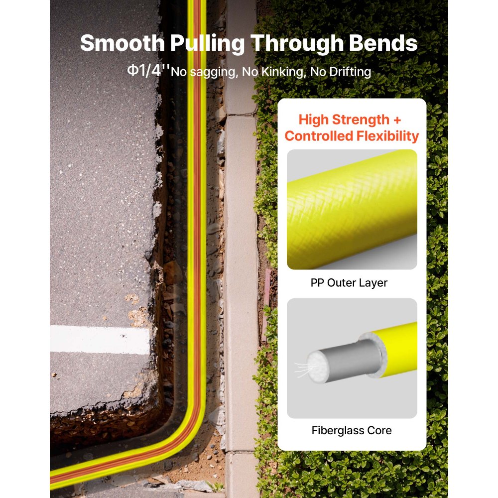 Zasięg 100 m (328 stóp): Ta taśma z włókna szklanego o długości 100 m (328 stóp) idealnie nadaje się do układania kabli na dużych powierzchniach i na duże odległości, redukując liczbę pociągnięć. Średnica 6,3 mm (1/4 cala) zapewnia idealną równowagę między wytrzymałością a elastycznością, umożliwiając płynne przeciąganie przez rury i zagięcia bez załamań.