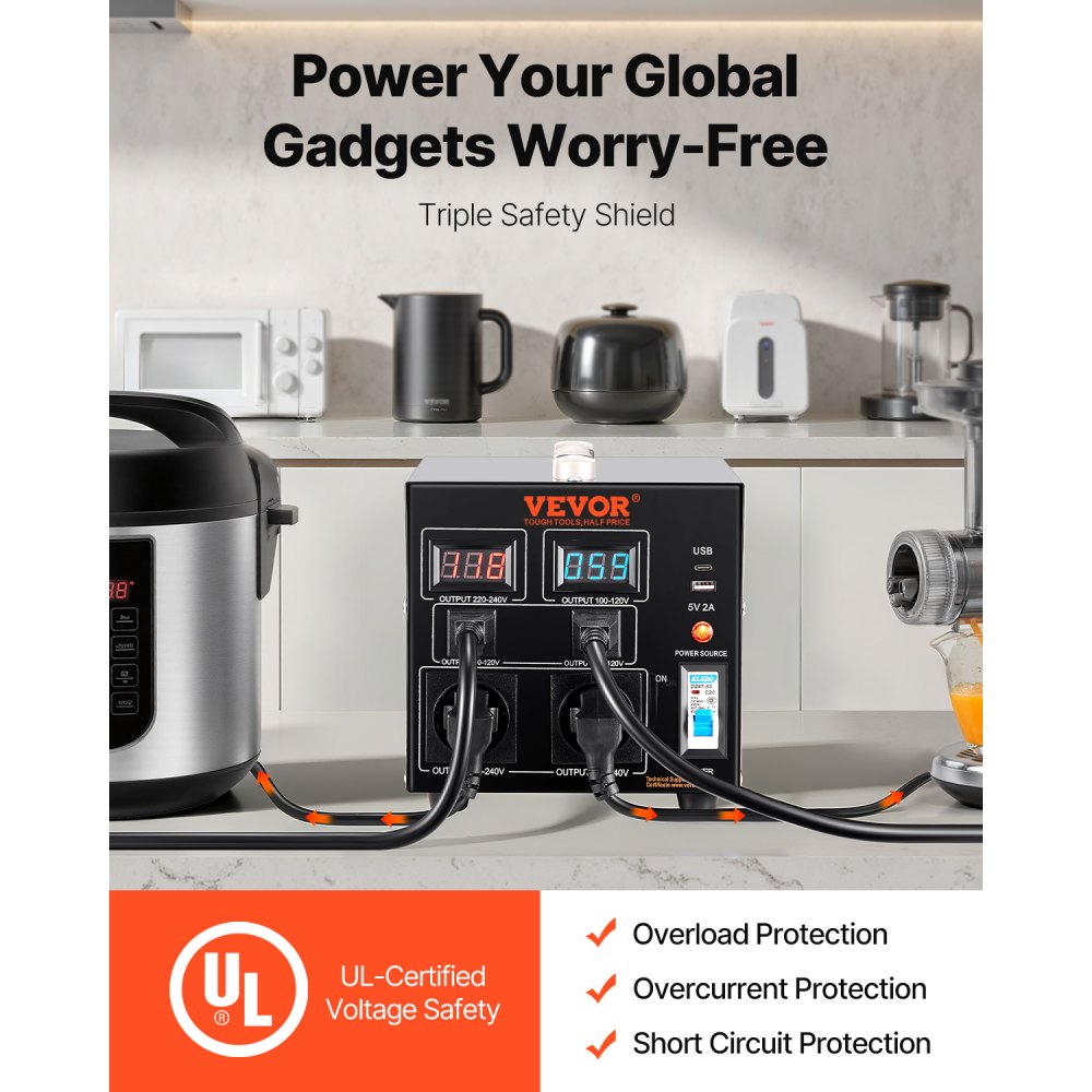 Transformator podwyższający napięcie 2000 W: Ten transformator podwyższający/obniżający napięcie posiada 4 gniazda AC, w tym 2 amerykańskie gniazda wyjściowe NEMA 5-15R z trzema bolcami, 2 europejskie gniazda wyjściowe Shucko, 1 port USB 5 V i 1 port żeński typu C. Jest wyposażony w 2 wskaźniki LED, które wyświetlają aktualne napięcie wyjściowe w czasie rzeczywistym, aby zapobiec przeciążeniu transformatora.
