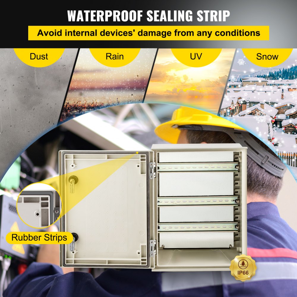 Stopień wodoodporności IP66: Taśma uszczelniająca ma doskonałe właściwości uszczelniające, a korpus skrzynki elektrycznej z włókna szklanego zapewnia optymalny poziom ochrony IP66, który zapobiega przedostawaniu się brudu i wody do pudełka po otwarciu pokrywy. Utrzymuj wszystkie obwody w bezpiecznym porządku.