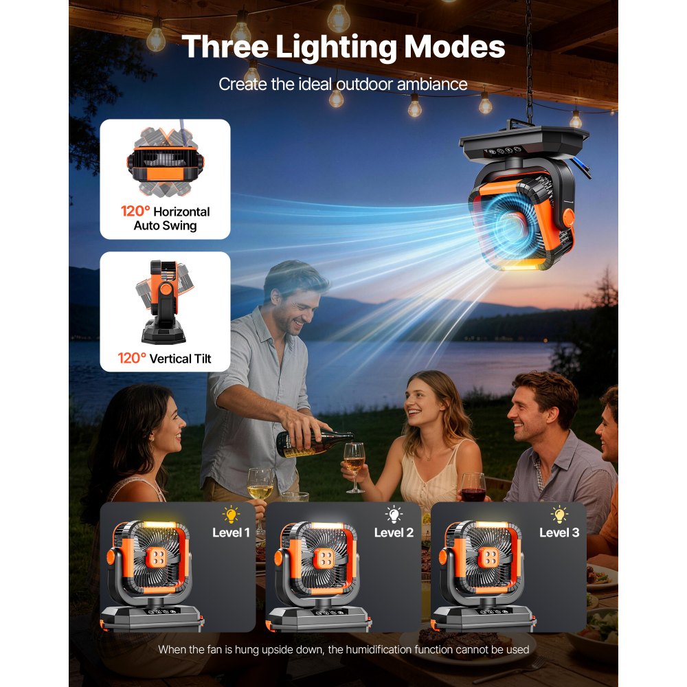 Regulowane tryby oświetlenia: Nasz wentylator chłodzony wodą oferuje trzy tryby oświetlenia, umożliwiając regulację jasności podczas spotkań, biwakowania lub codziennego użytku. Dzięki możliwości obrotu w poziomie o 120° i pochyleniu w pionie o 120°, zapewniony jest równomierny przepływ powietrza i rozproszenie światła, co zapewnia optymalny komfort pod różnymi kątami.