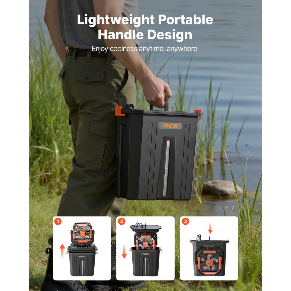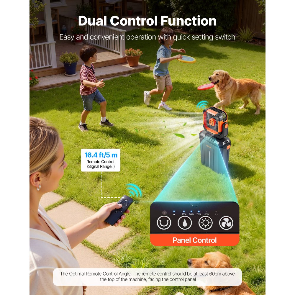 Wydajny akumulator: Ten wentylator mgiełkowy VEVOR jest wyposażony w akumulator o pojemności 20 000 mAh, który ładuje się w ciągu około 9–12 godzin i zapewnia długotrwałe chłodzenie po każdym ładowaniu. Idealny do codziennego użytku i aktywności na świeżym powietrzu, zapewnia orzeźwiający komfort w każdym miejscu dzięki stałemu przepływowi powietrza i delikatnej mgiełce.