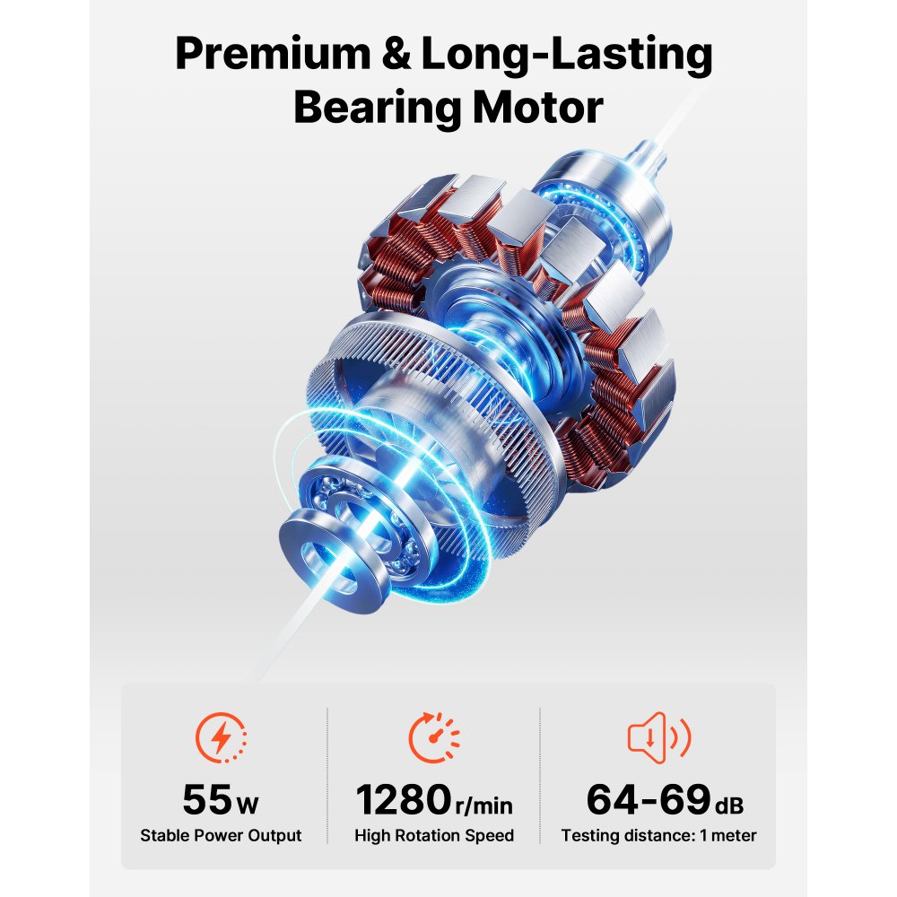 Mocny silnik: Wyposażony w solidny, wysokowydajny silnik o mocy 55 W, nasz wentylator osiąga prędkość do 1280 obr./min. Zapewnia silny i ciągły przepływ powietrza przy niskim poziomie hałasu ≤64–69 dB, gwarantując wydajne chłodzenie bez zakłócania codziennego życia.
