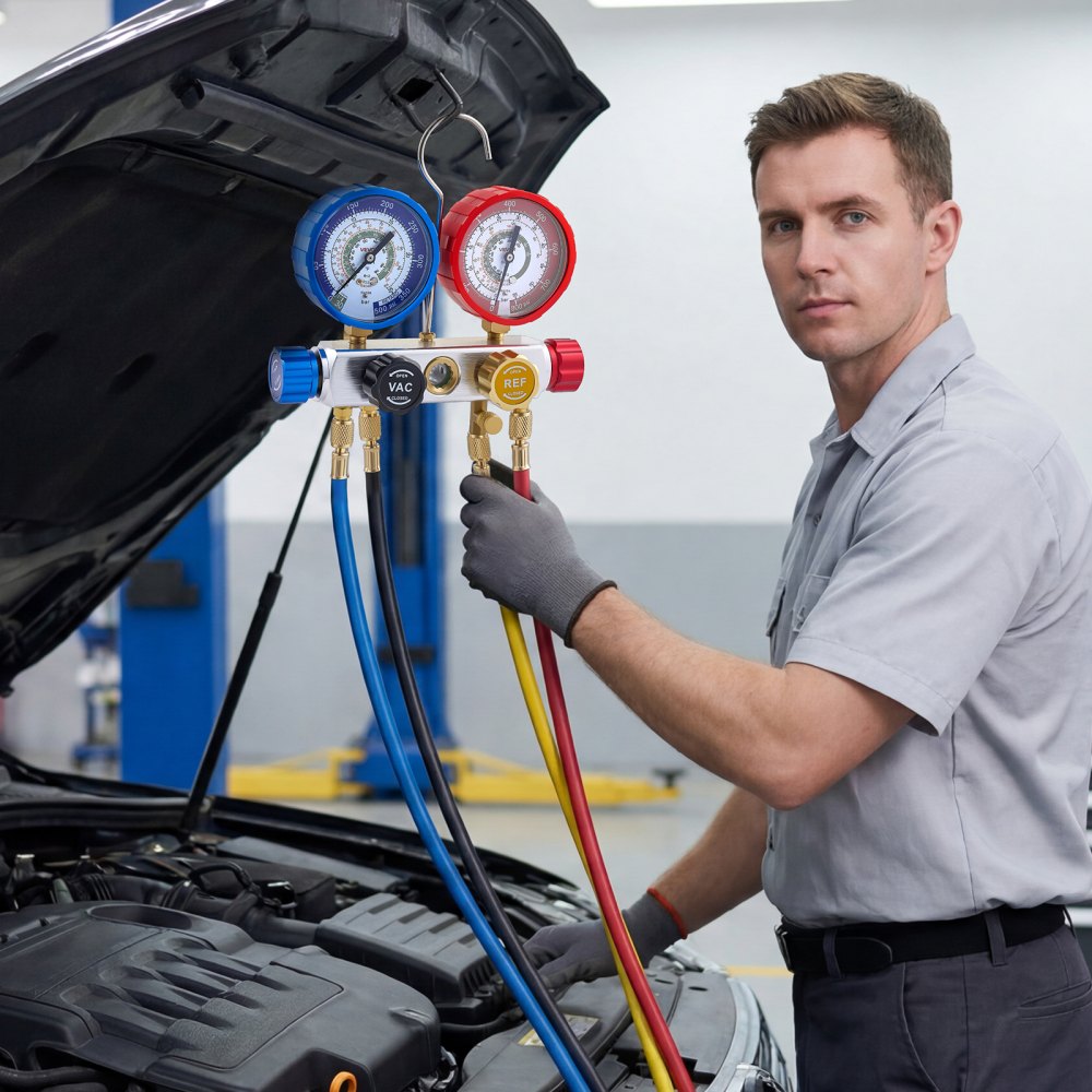 Zestaw manometrów do klimatyzacji VEVOR do czynników chłodniczych R22, R404A, R410A i R12, manometr 4-drożny z wężami 1,5 m, do konserwacji, opróżniania, napełniania i odzyskiwania powietrza z układów klimatyzacji w pojazdach i domach - Klimatyzacja | Galaxy Sklep