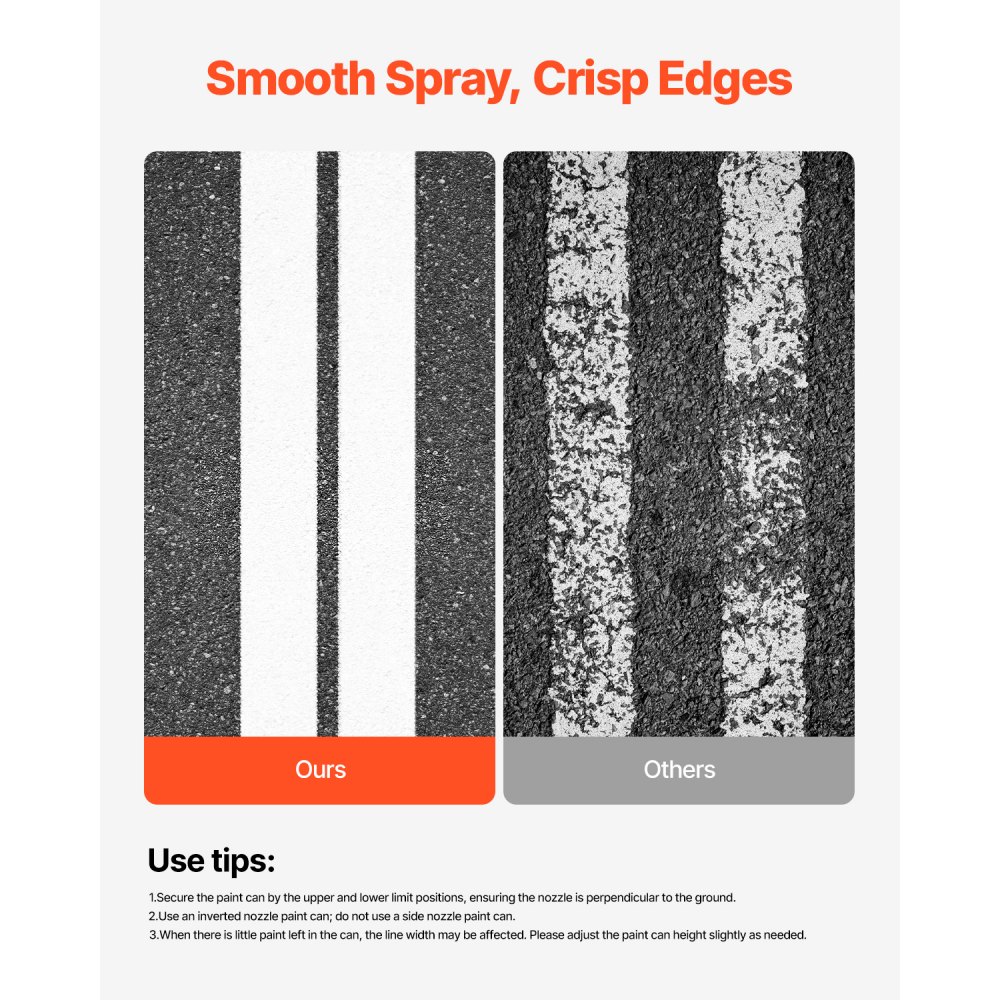 Regulowana szerokość linii 56-102 mm: Dostosuj wysokość puszki z farbą, aby ustawić szerokość linii. Używaj wyłącznie puszek z farbą typu T z tym urządzeniem – unikaj dysz skierowanych prosto w górę lub w dół. Ustaw dyszę typu T równolegle do szczeliny w kształcie litery U, aby uzyskać precyzyjne pasy o szerokości 56-102 mm (2-4 cale). Jeśli w puszce znajduje się mniej farby, dostosuj wysokość, aby uzyskać pożądaną szerokość pasów.