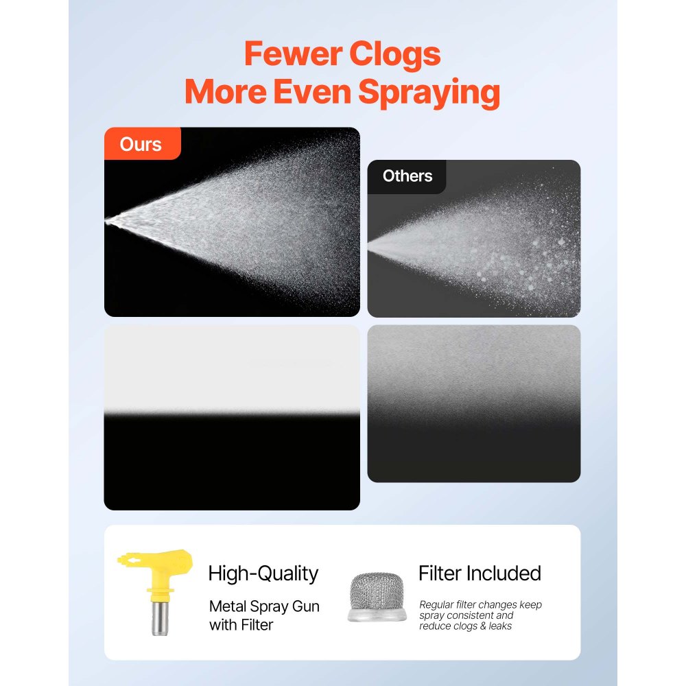 Idealne rezultaty powlekania: Wysokiej jakości dysza zapewnia precyzyjną kontrolę i minimalizuje nadmierne rozpylanie. Nasz bezpowietrzny system natryskowy wyposażony jest w filtr i uszczelki, które zapobiegają zatykaniu i wyciekom, gwarantując równomierne pokrycie.
