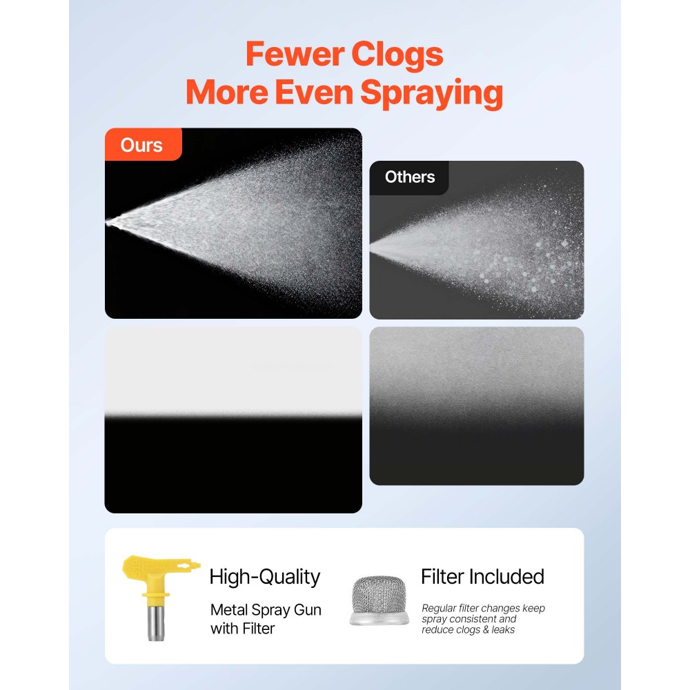 Wydajne powlekanie: Silnik o mocy 1500 W, przepływ 0,7 GPM (2,65 l/min) i ciśnienie 3300 psi umożliwiają natrysk 8 razy szybszy niż wałki i 20 razy szybszy niż pędzle. Nasz bezpowietrzny agregat malarski idealnie nadaje się do dużych projektów, takich jak osiedla mieszkaniowe i budynki.