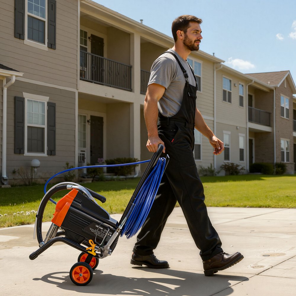Praktyczna konstrukcja: Podstawa natrysku hydrodynamicznego z kółkami zapewnia płynną mobilność, a drążek umożliwia natrysk zarówno wysoko, jak i nisko położonych powierzchni, eliminując konieczność wspinania się i schylania. Elastyczny wąż ssący pobiera farbę z wiader o pojemności od 1 do 5 galonów, co pozwala na wszechstronne zastosowanie.