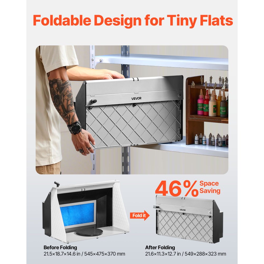 Przenośna konstrukcja: Kabina natryskowa składa się do kompaktowej, lekkiej obudowy, co ułatwia transport. Wymiary po rozłożeniu to 545 x 475 x 370 mm (21,5 x 18,7 x 14,6 cala), zapewniając elastyczną przestrzeń roboczą w dowolnym miejscu i czasie. Idealna kabina natryskowa dla kreatywnych osób w podróży.
