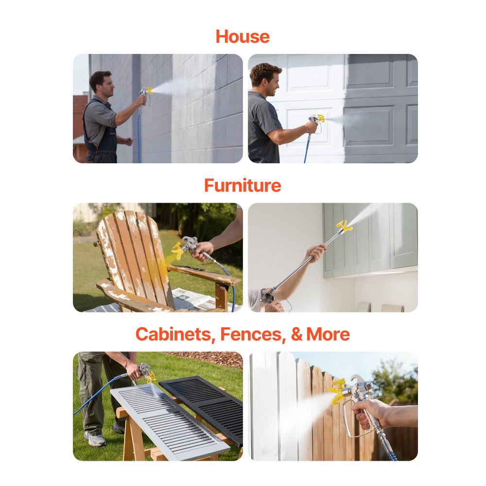 Nadaje się do różnych powłok: Ten pistolet natryskowy klasy komercyjnej nadaje się do nakładania farb ściennych do wnętrz, rozcieńczonych klejów, uszczelniaczy ściennych oraz powłok metalowych. Idealnie nadaje się do projektów z różnymi materiałami i minimalizuje konieczność wymiany sprzętu.
