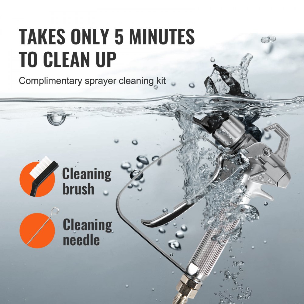 Nie musisz martwić się o czyszczenie: Ten bezpowietrzny pistolet natryskowy do zastosowań wewnętrznych i zewnętrznych jest łatwy w czyszczeniu po użyciu. Wystarczy przepłukać go roztworem czyszczącym na bazie wody lub rozpuszczalnika, aż do usunięcia całej farby i plam. To takie proste! Oferujemy również zestaw czyszczący, który pozwala użytkownikom usunąć kurz, aby uzyskać lepsze rezultaty i wydłużyć żywotność pistoletu natryskowego. Gotowy na kolejny duży projekt?
