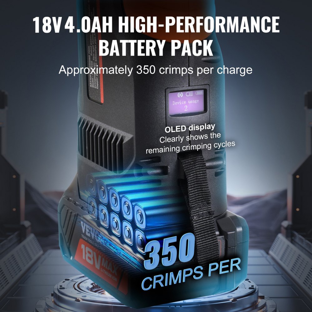 Szybki proces zaciskania: Każdy cykl zaciskania trwa zaledwie 3-6 sekund, a skok 40 mm gwarantuje szybkie i precyzyjne zaciskanie. Ten zestaw zaciskarki z akumulatorem oszczędza czas pracy i zwiększa produktywność. Wyposażony w wyświetlacz OLED, który zapewnia wyraźny podgląd poziomu naładowania akumulatora, stanu pracy i danych zaciskania, umożliwiając użytkownikom monitorowanie stanu narzędzia w czasie rzeczywistym.