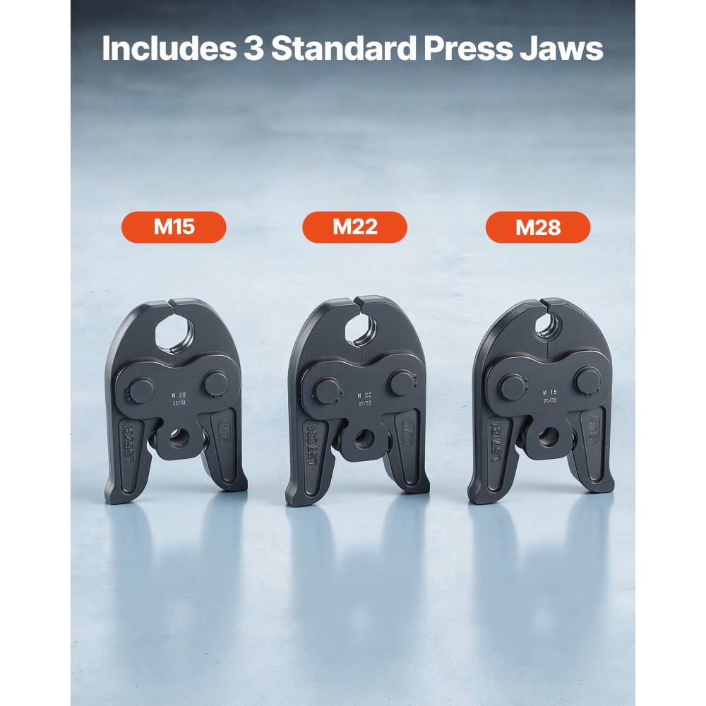 Wszechstronne rozmiary szczęk: Ta zaciskarka do rur zawiera trzy szczęki zaciskowe (M15, M22, M28) przeznaczone do europejskich systemów rur ze stali nierdzewnej o profilu M. Każda szczęka umożliwia precyzyjne i bezpieczne zaciskanie, gwarantuje szczelność połączeń i pomaga zmniejszyć ryzyko wycieku.