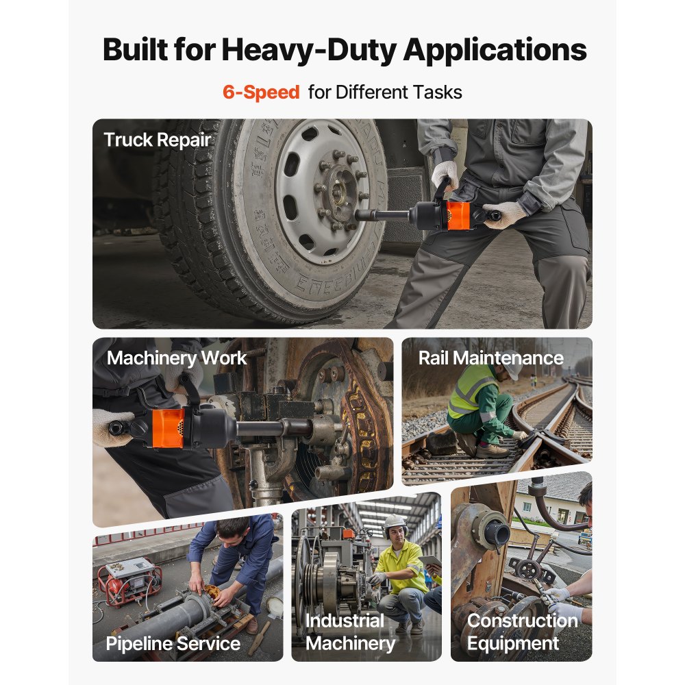 Do wymagających zadań: 1-calowe pneumatyczne klucze udarowe VEVOR zapewniają duży moment obrotowy do odkręcania lub dokręcania śrub i nakrętek. Idealne do napraw i konserwacji ciężkich pojazdów ciężarowych, przyczep, autobusów i maszyn rolniczych.