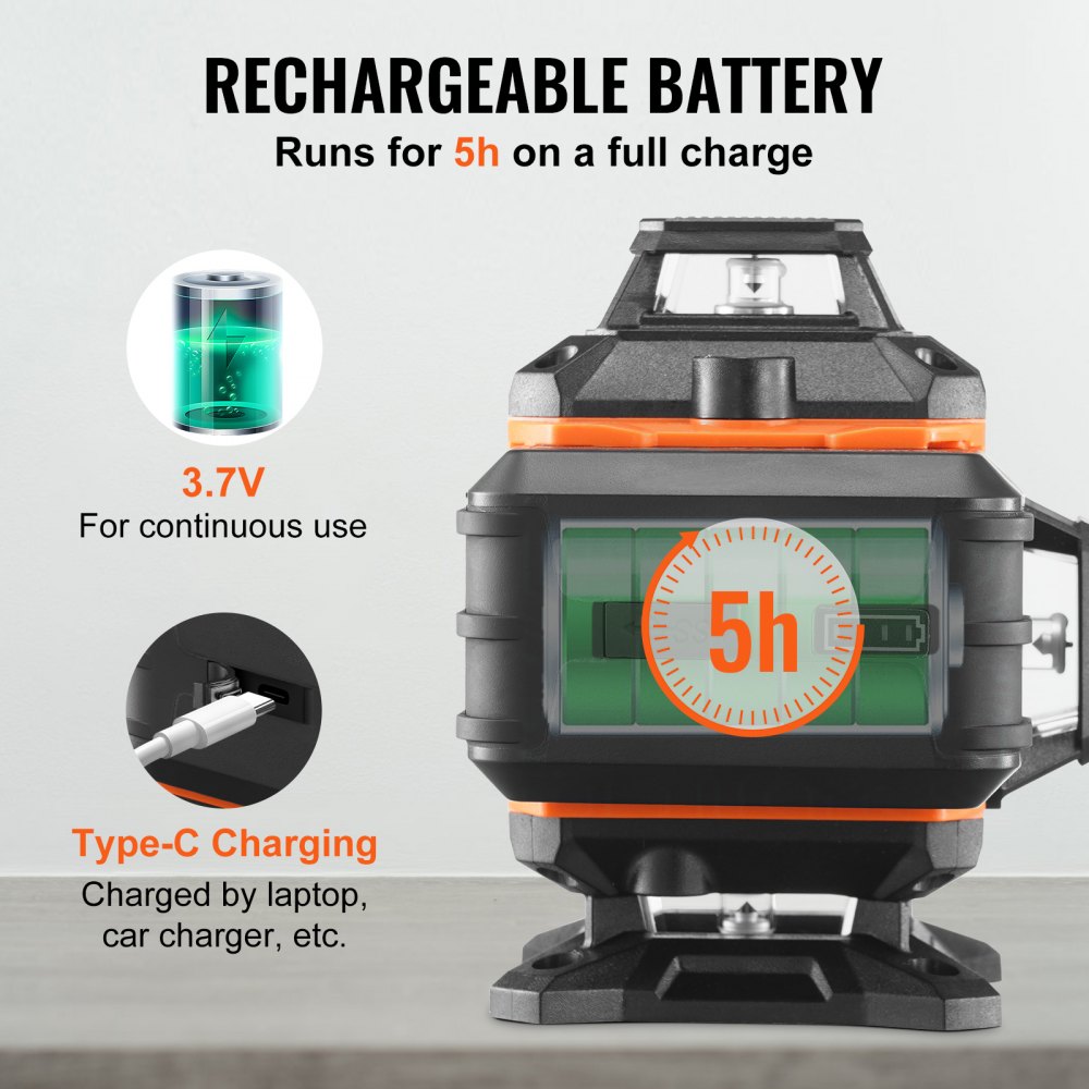 Szybkie ładowanie: Nasz laser krzyżowy jest wyposażony w akumulator 3,7 V, który zapewnia około 5 godzin pracy. Laser jest również wyposażony w port ładowania typu C, co umożliwia dalsze użytkowanie w miejscu pracy po rozładowaniu akumulatora. Można go łatwo podłączyć do laptopa, przenośnego powerbanku lub zasilacza sieciowego w celu szybkiego ładowania.