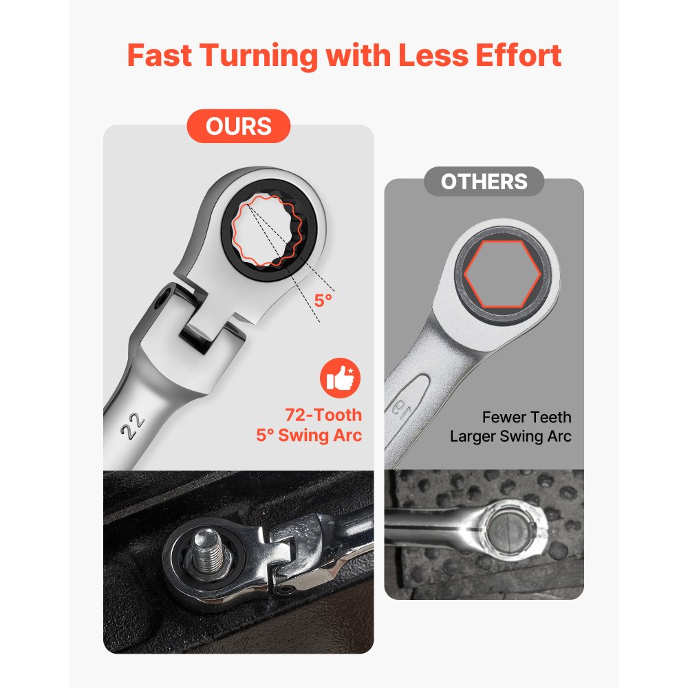 Płynne obracanie dla szybkiej pracy: 72-zębowa grzechotka i 5-stopniowy mikroobrót minimalizują ruchy dłoni, umożliwiając precyzyjną kontrolę nawet w ciasnych przestrzeniach. Ten elastyczny zestaw kluczy grzechotkowych charakteryzuje się antypoślizgowym uchwytem i precyzyjnym zazębieniem, co zapewnia płynne i bezproblemowe obracanie.