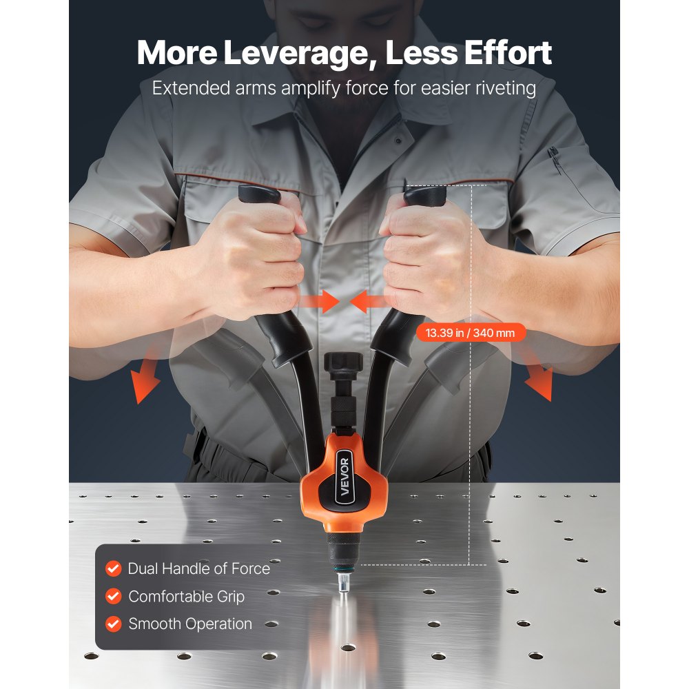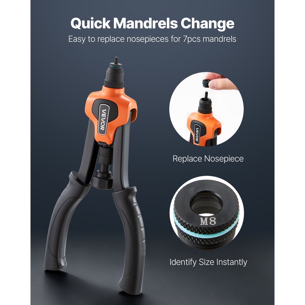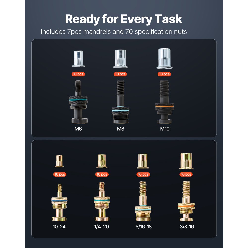 Zestaw narzędzi do nitonakrętek VEVOR 34 cm, dwuręczny nitownik z 7 trzpieniami i 70 nakrętkami w rozmiarach metrycznych i SAE (M6, M8, M10, 10-24, 1/4-20, 5/16-18, 3/8-16 UNC) w zestawie z walizką, do użytku domowego i samochodowego