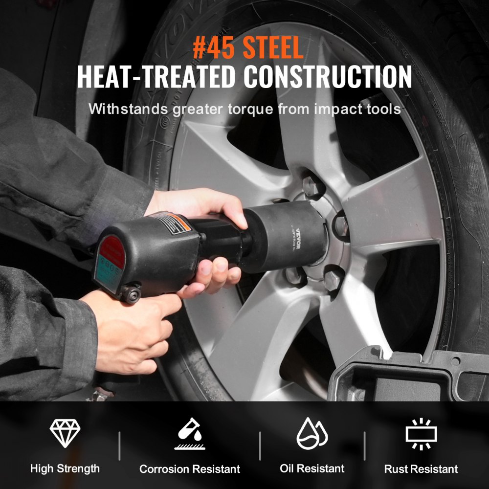 Odporny na wstrząsy i korozję: Wykonany z hartowanej stali CR-MO, zestaw nasadek udarowych wytrzymuje wysoki moment obrotowy narzędzi udarowych. Czerniona powierzchnia poprawia odporność na korozję, dzięki czemu jest odporny na rdzę, olej, brud i wyjątkowo trwały, co umożliwia długotrwałe użytkowanie w naprawach samochodowych.