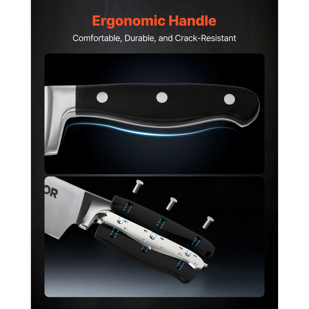Niezwykle wygodny uchwyt: Ergonomiczna rękojeść pewnie leży w dłoni i zapewnia wyważony chwyt, zapobiegając zmęczeniu. Wytrzymały materiał ABS jest odporny na ciepło, zimno i pęknięcia, a precyzyjne wykonanie zapobiega luzowaniu się i pękaniu, dzięki czemu ten zestaw noży ze stali nierdzewnej jest niezawodnym towarzyszem.