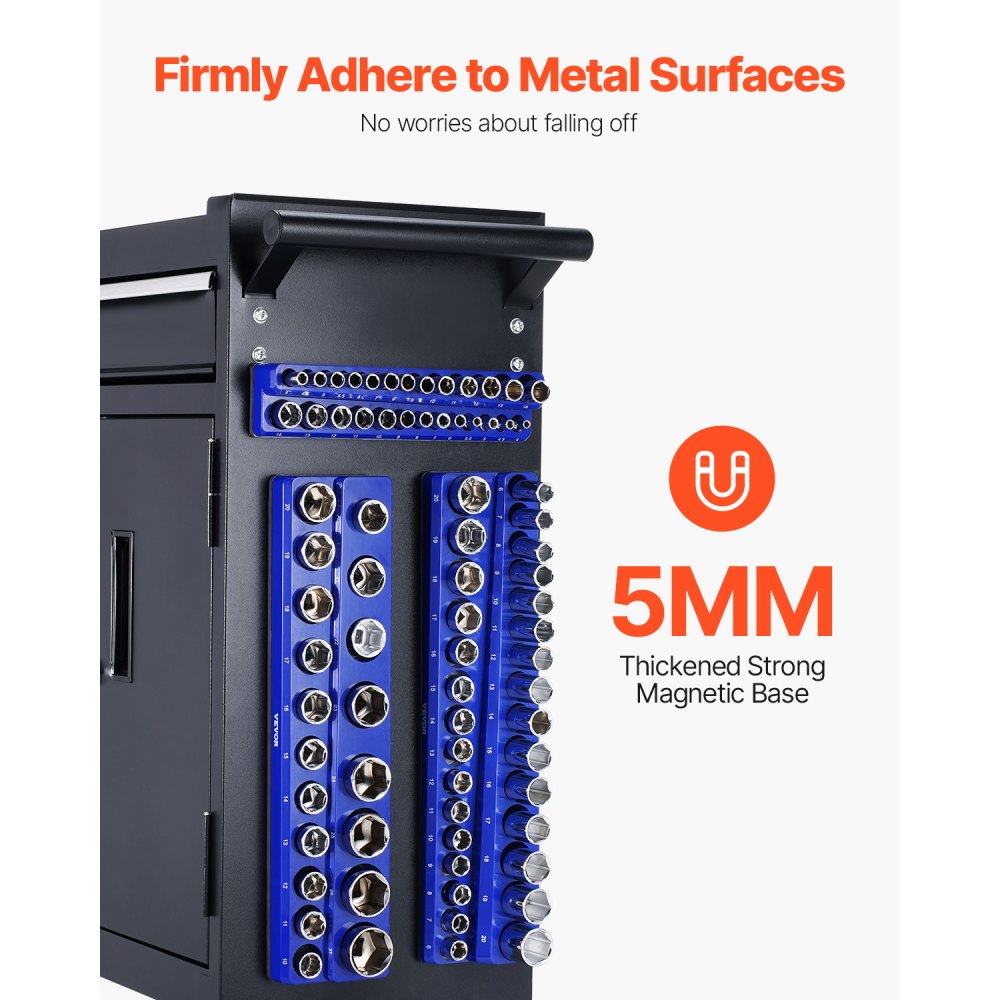 Profesjonalny design: Nasze niebieskie organizery na nasadki są produkowane zgodnie ze standardami branżowymi i zaprojektowane specjalnie do nasadek metrycznych (z napędem 1/4 cala, 3/8 cala i 1/2 cala). Te magnetyczne uchwyty na nasadki ułatwiają organizację i pozwalają szybko znaleźć odpowiednią nasadkę, zwiększając wydajność pracy.