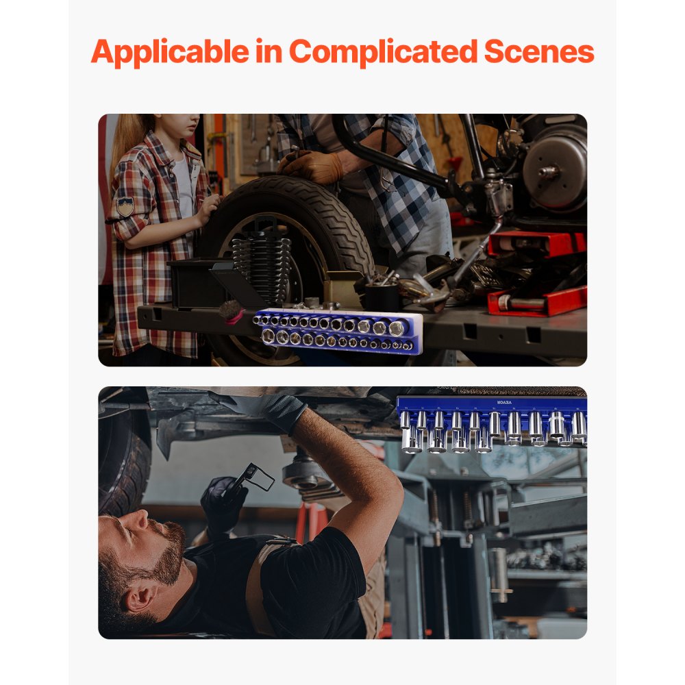 Szerokie zastosowanie: Idealny do użytku w warsztatach 4S, fabrykach, warsztatach samochodowych, naprawach sprzętu AGD i warsztatach domowych. Zestaw uchwytów na nasadki metryczne VEVOR zapewnia wygodne rozwiązania do przechowywania w różnych sytuacjach.