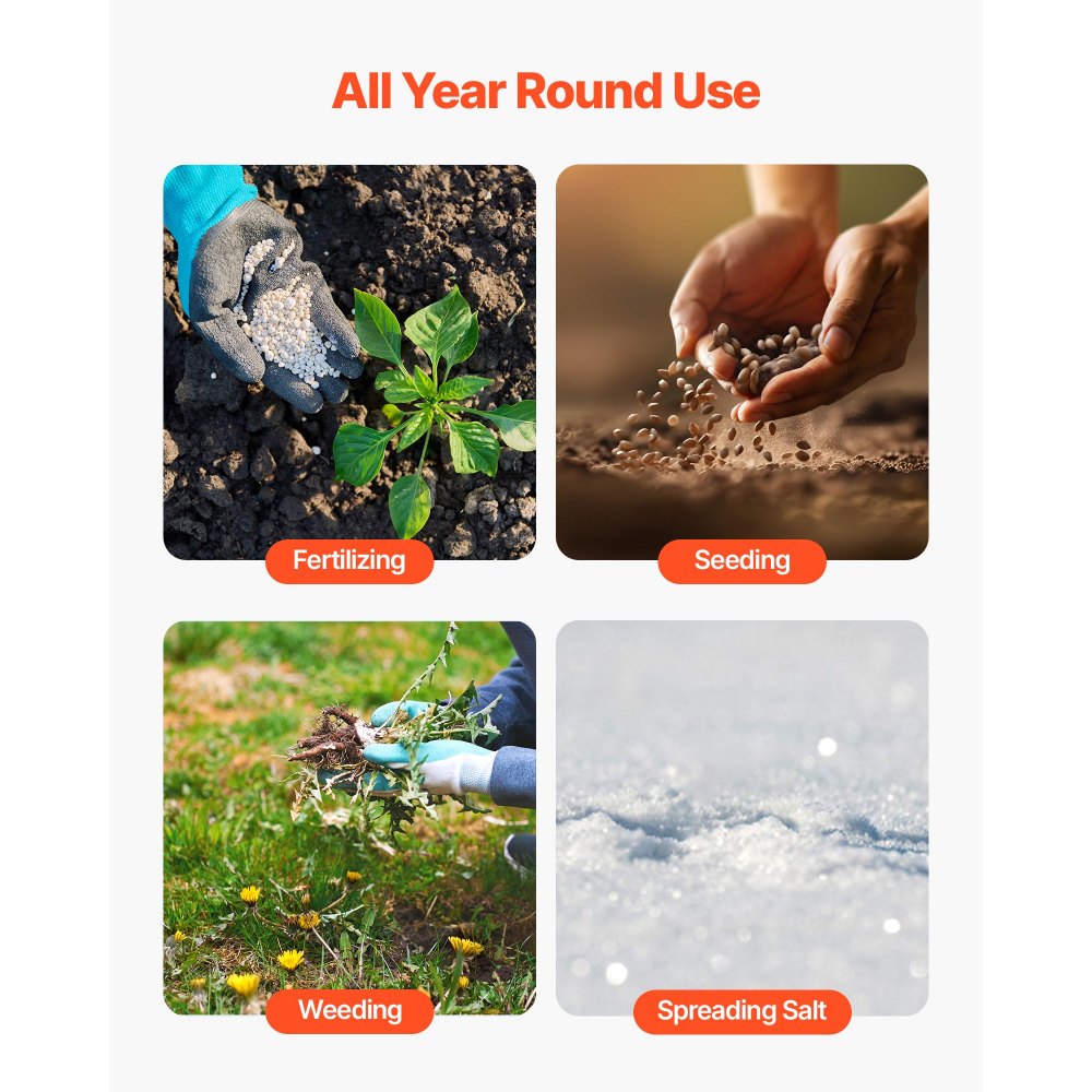 Wytrzymały materiał: Dzięki malowanej proszkowo stalowej ramie i przeciwwybuchowemu pojemnikowi, ten rozsiewacz oferuje odporność na promieniowanie UV, rdzę i uderzenia. Wyposażony w 10-calowe opony do trawy, nadaje się do wszystkich nawierzchni, takich jak trawa, żwir i śnieg, dzięki czemu idealnie nadaje się do użytku na zewnątrz.