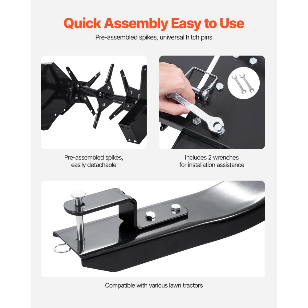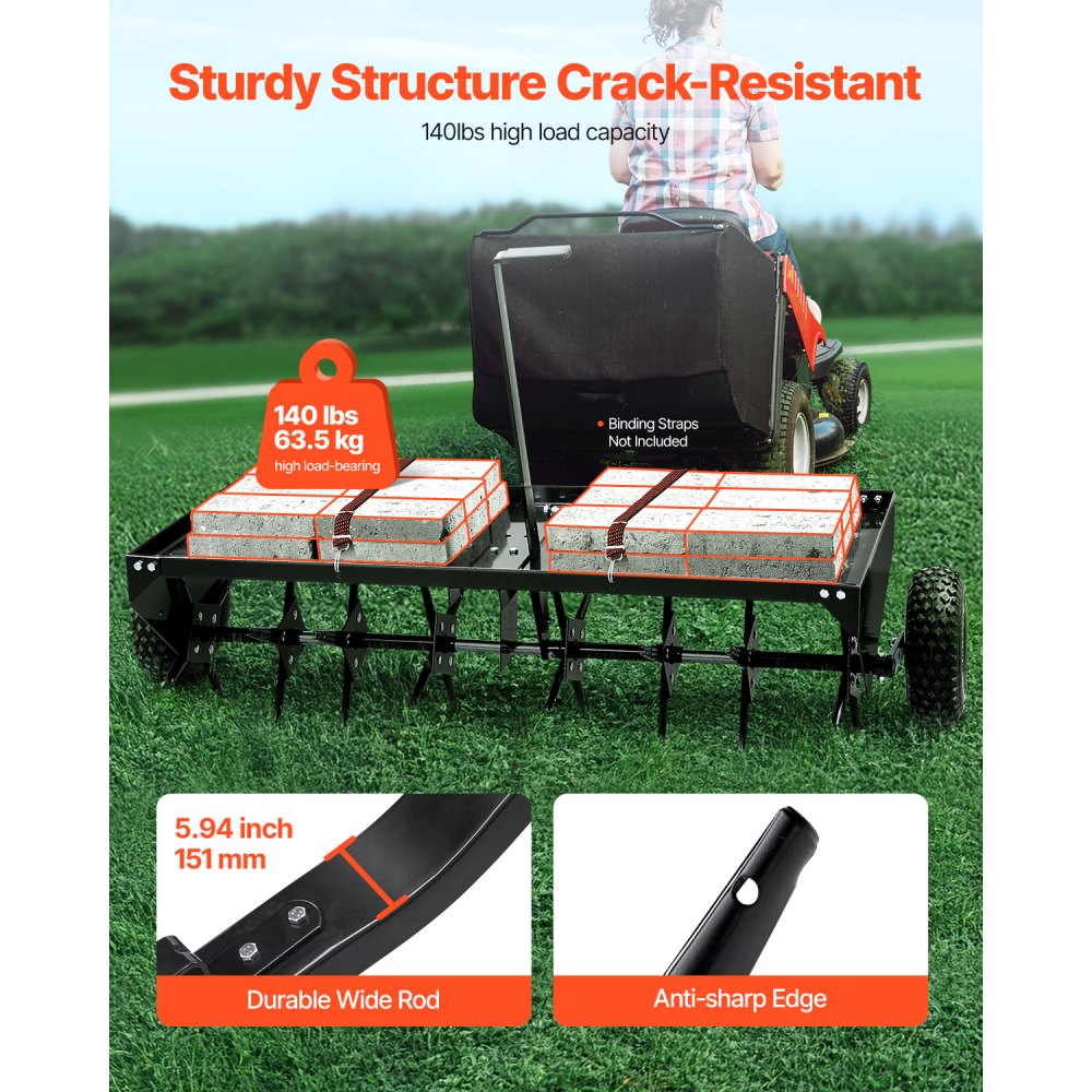 Nośność 63 kg: Solidna powierzchnia ładunkowa aeratora holowniczego umożliwia umieszczanie ciężkich przedmiotów, zwiększając tym samym siłę penetracji kolców. Każdy kolec wyposażony jest w krawędź ochronną, która minimalizuje ryzyko. Wzmocnione pręty i uniwersalne złącze można łatwo podłączyć do różnych ciągników, są one solidne i trwałe.