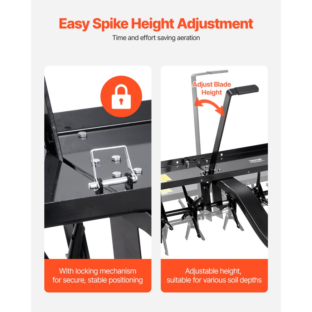 Regulowana wysokość: Możesz regulować wysokość tacy za pomocą uchwytu podnoszącego aeratora trawnikowego, aby uzyskać idealną głębokość penetracji lub dostosować ją do różnej wysokości gleby. Mechanizm blokujący gwarantuje bezpieczną pozycję i zapobiega przypadkowemu zwolnieniu lub odpięciu w trakcie użytkowania.