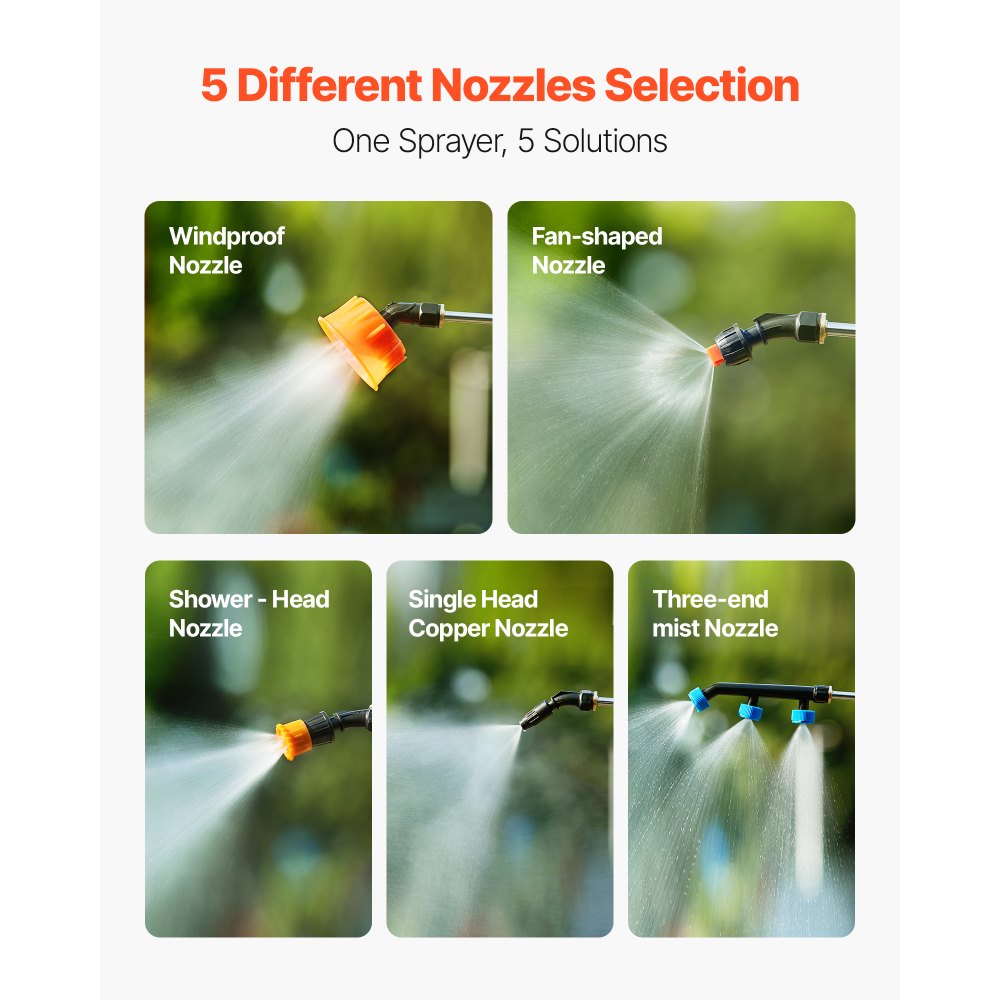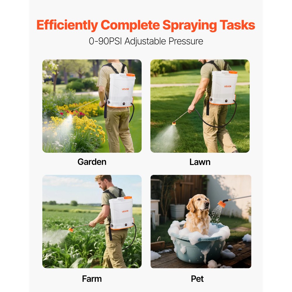 Precyzyjne natryskiwanie pod wysokim ciśnieniem: Ten elektryczny opryskiwacz ma regulowane ciśnienie od 0 do 90 PSI (0–6 barów), co umożliwia łatwe przełączanie między trybami mgiełki i strumienia. Ten zasilany bateryjnie opryskiwacz jest idealny do prac ogrodniczych i czyszczenia.