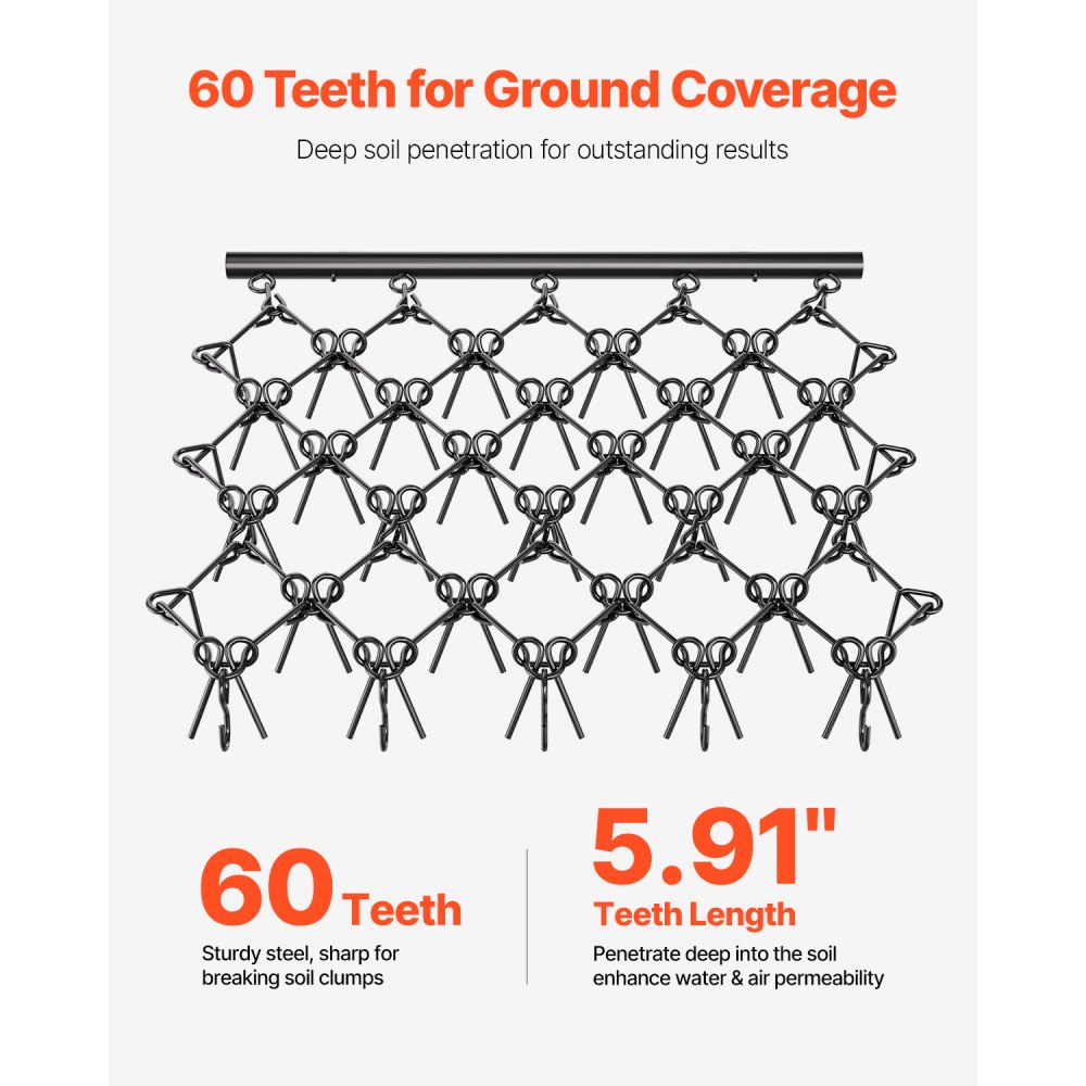 Niesamowity efekt wyrównywania: Dzięki 60 zębom o długości 15 cm, ta brona łańcuchowa bez trudu rozbija bryły i spulchnia twardą glebę, tworząc gładką i równą powierzchnię. Ważąca 26 kg, skutecznie wyrównuje teren i umożliwia szybkie i efektywne przygotowanie gleby.