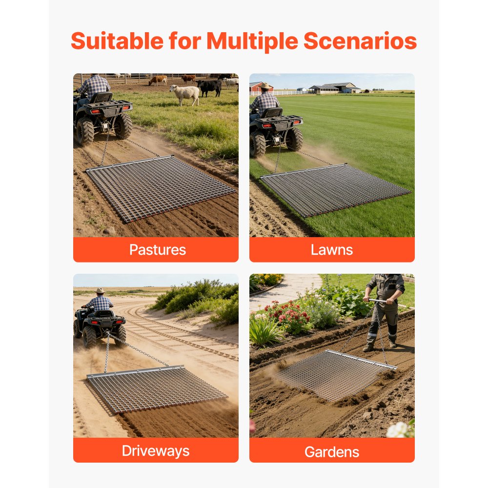 Wszechstronne zastosowanie: Ta brona łąkowa nadaje się do pojazdów ATV/UTV, traktorków ogrodowych i ciągników kompaktowych. Można ją również ciągnąć ręcznie i nadaje się do wyrównywania i pielęgnacji terenów przez cały rok.