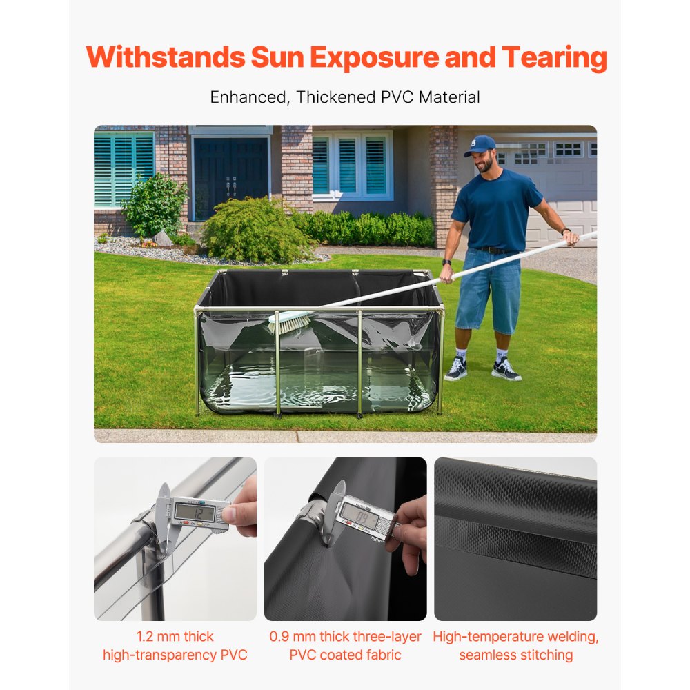 Materiały wysokiej jakości: Wykonany ze wzmocnionej 0,9 mm grubości trzywarstwowej tkaniny z PVC i 1,2 mm grubości wysoce przezroczystego PVC, ten płócienny staw rybny jest trwały, odporny na słońce i rozdarcia. Zapewnia wyraźny widok, jest odporny na zużycie i zarysowania oraz ma bezszwową konstrukcję, aby zapobiec przeciekom.