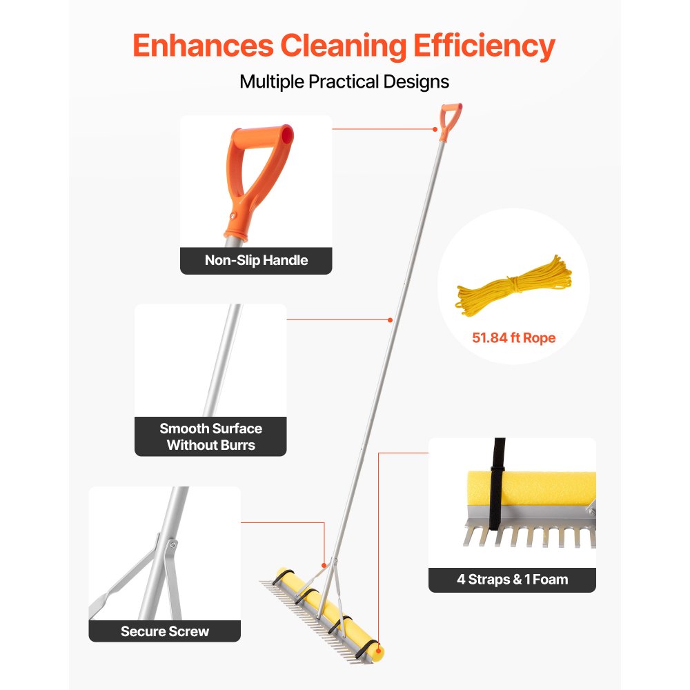 Praktyczna konstrukcja: Antypoślizgowy uchwyt zapewnia pewny chwyt. W zestawie znajduje się 15,8-metrowa linka przedłużająca i wyporna pianka, które ułatwiają i usprawniają czyszczenie jeziora. Bezpieczne śruby mocują głowicę grabi na miejscu.
