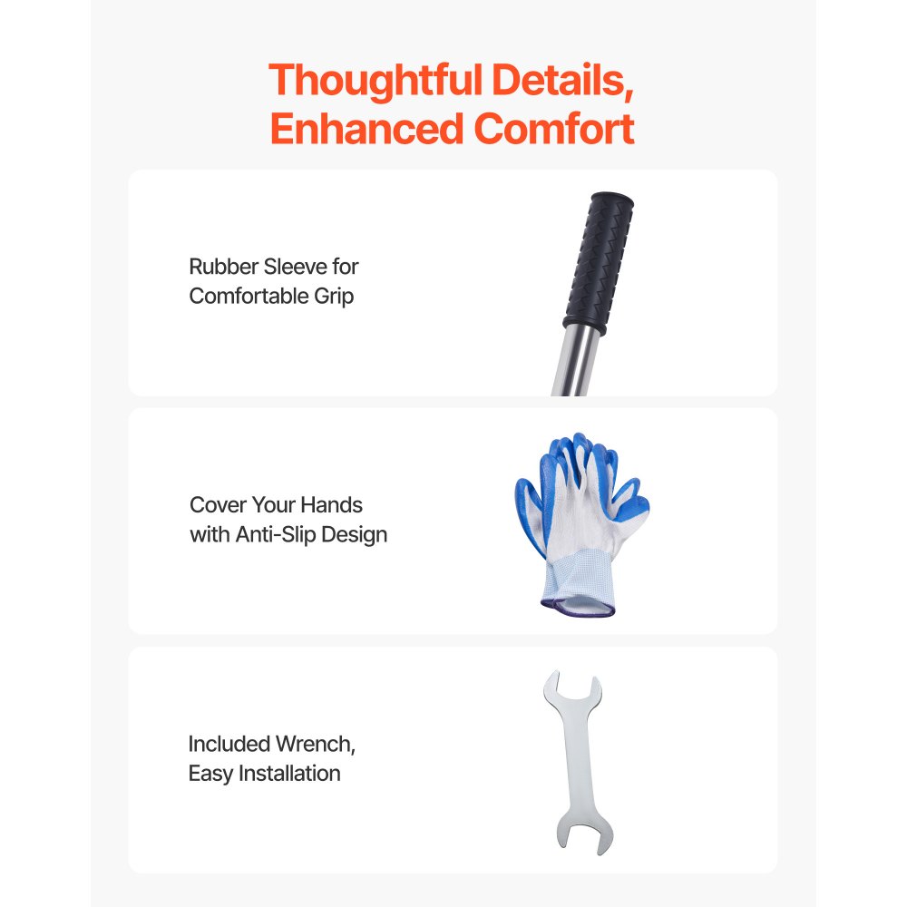 Łatwy montaż: W zestawie znajduje się instrukcja i rękawiczki, co pozwala na szybki montaż i demontaż grabi wyrównującej. Wystarczy wyrównać gwint uchwytu, wkręcić go i dokręcić. Zamontuj płytę podstawy, zabezpiecz ją śrubami i dokręć kluczem. Montaż jest szybki i łatwy.
