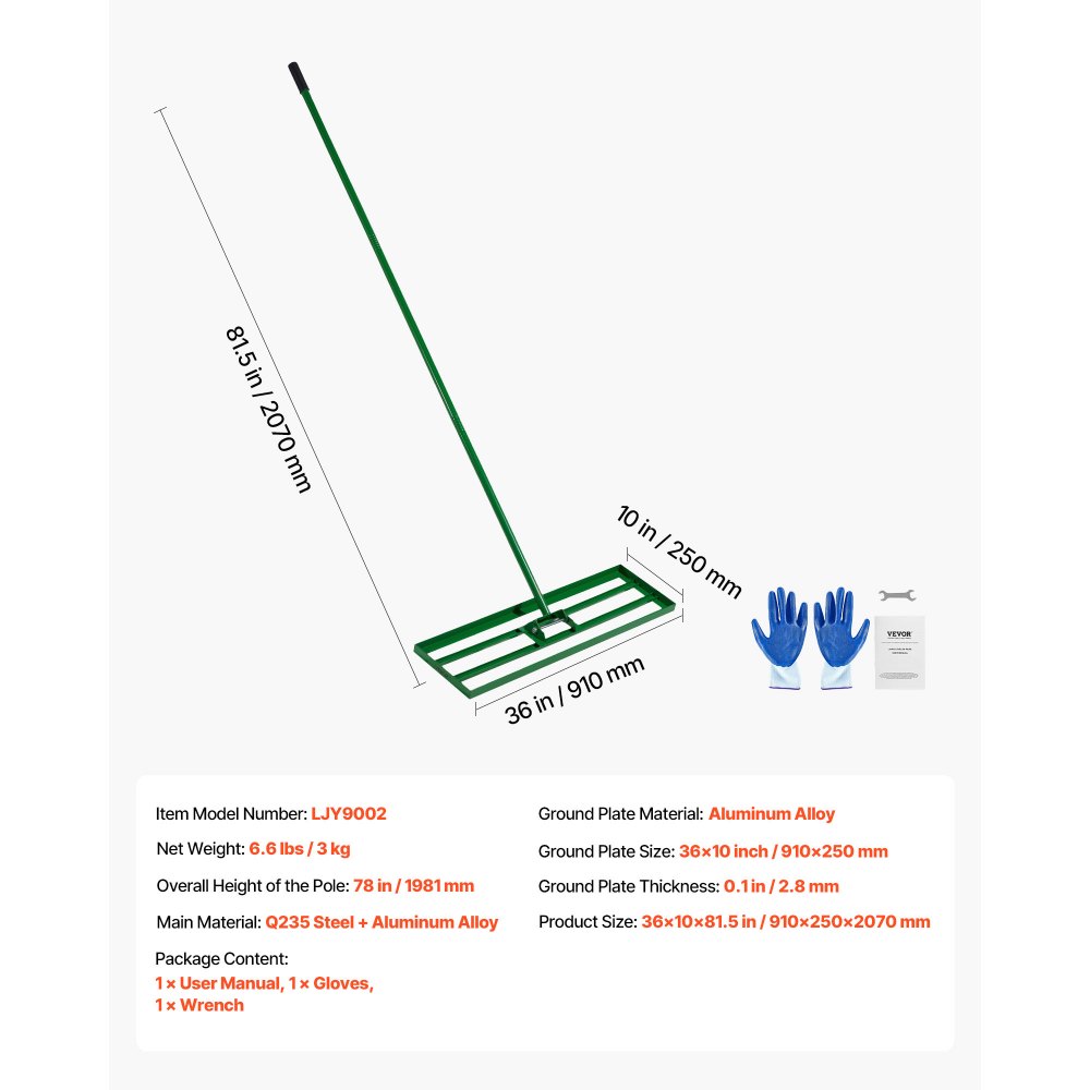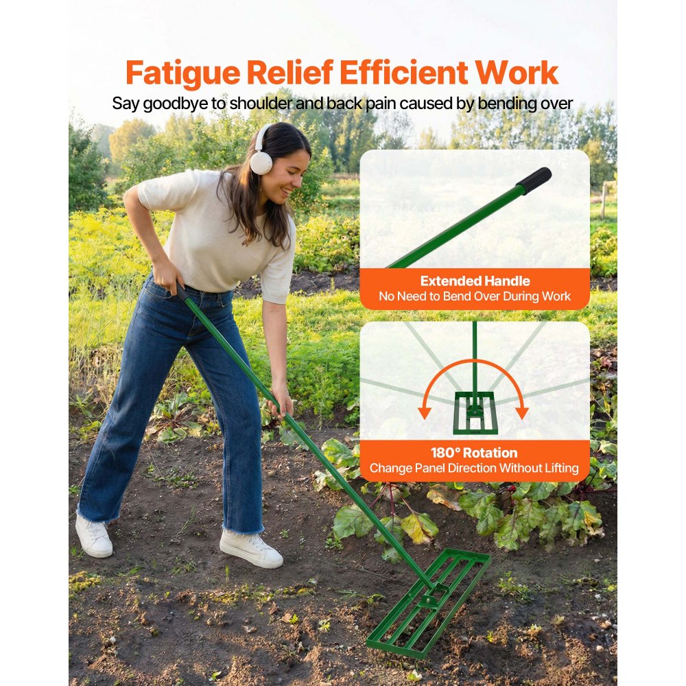 Duże grabie do trawników: grabie wyrównujące trawnik VEVOR z podstawą o wymiarach 910 x 250 mm (36 x 10 cali) szybko i skutecznie wyrównują podłoże, oszczędzając czas i wysiłek. Nadaje się do różnych powierzchni, takich jak trawniki, pola, ogrody i pola golfowe, do wyrównywania piasku, gleby, kompostu i mchu.