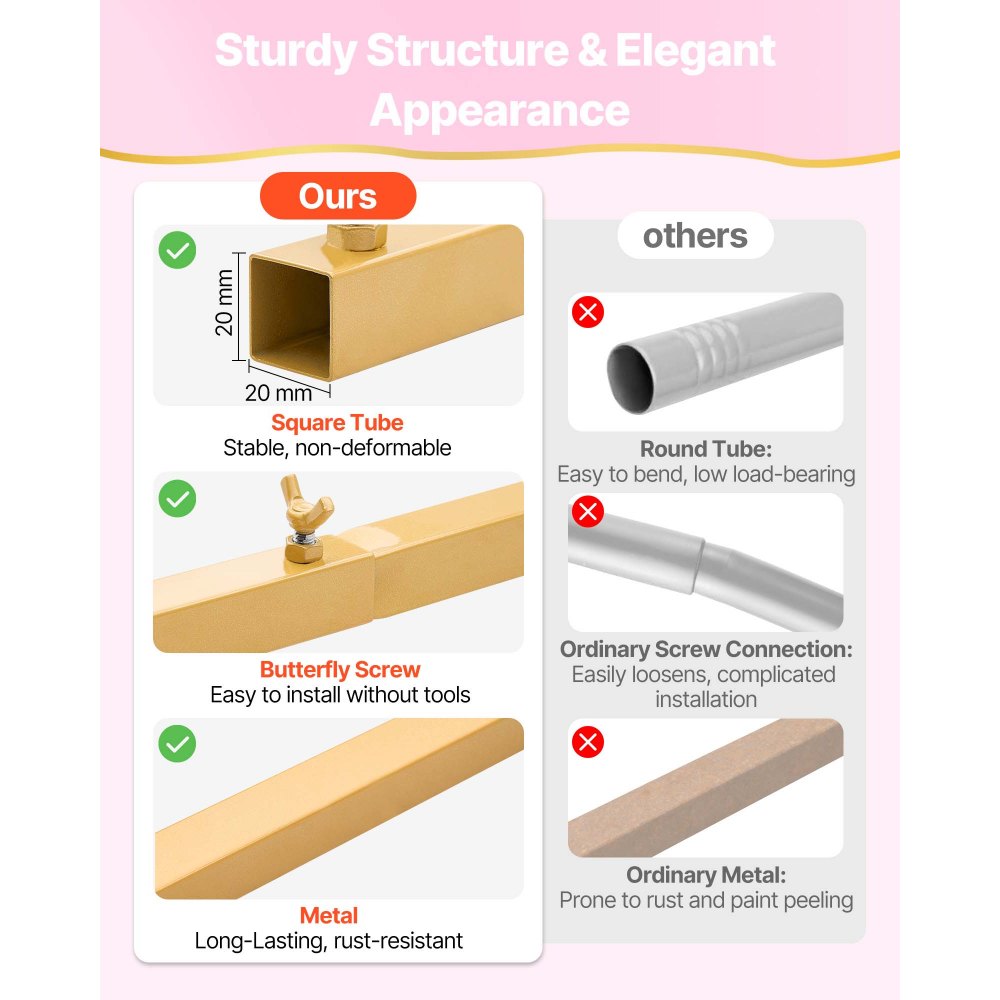Solidna konstrukcja: Nasz metalowy stojak w kształcie łuku jest odporny na blaknięcie kolorów, korozję i rdzę. Ulepszone, kwadratowe rurki o wymiarach 20 x 20 mm są odporne na zginanie i wyposażone w złącze tulejowe dla dodatkowej stabilności. Nadaje się do wielokrotnego użytku, zarówno wewnątrz, jak i na zewnątrz.