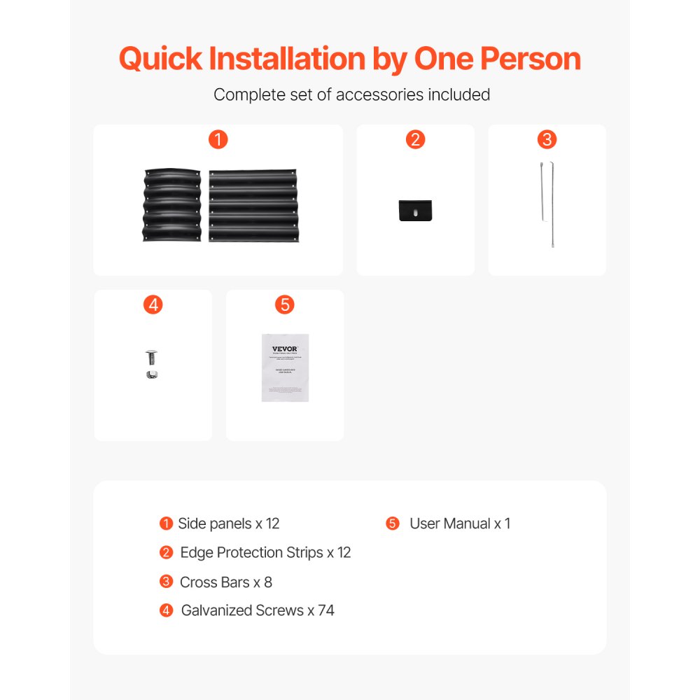 Co otrzymasz: Nasze podwyższone łóżko obejmuje 12 paneli bocznych, 8 poprzeczek, 12 listew zabezpieczających krawędzie, 74 ocynkowane śruby i instrukcję obsługi.