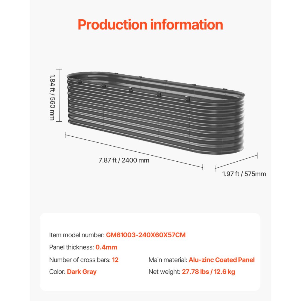 Metalowa podniesiona donica VEVOR, 240x60x56 cm, ocynkowana donica ogrodowa z otwartym dnem, do sadzenia, owalna donica warzywna do uprawy warzyw, kwiatów, ziół i sukulentów, ciemnoszara