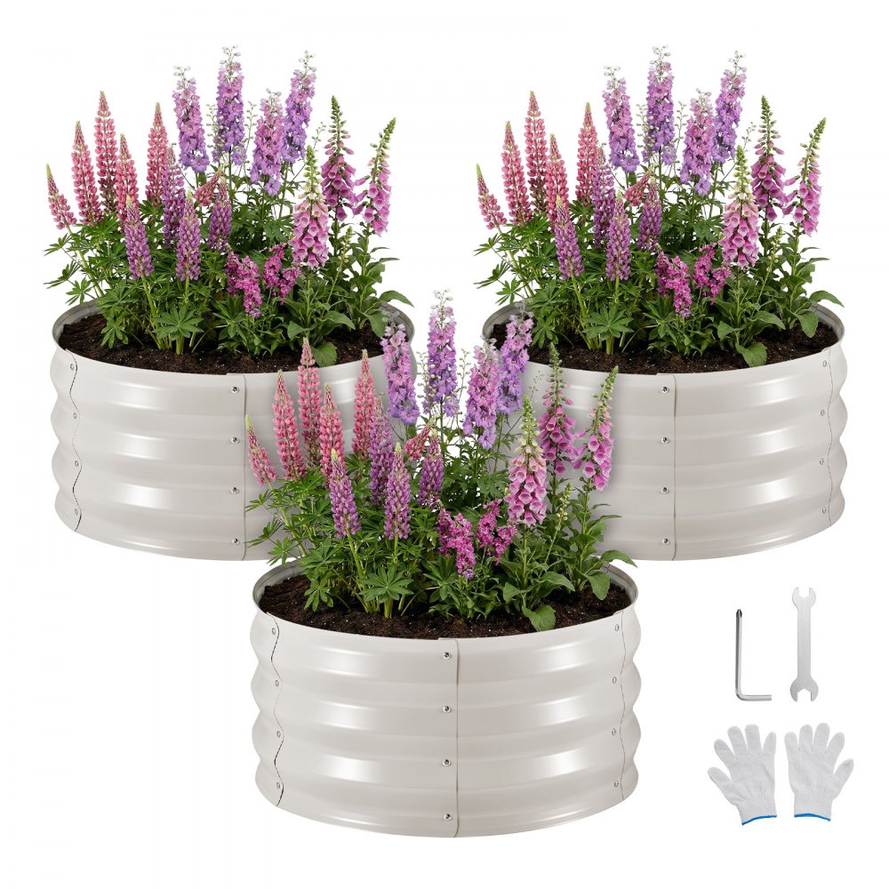 Metalowa podniesiona grządka ogrodowa, zestaw 3 szt., φ60 x 30 cm, okrągła grządka ogrodowa, zestaw doniczek ogrodowych, grządka warzywna z rękawiczkami, grządka bez dna, grządka do kwiatów, ziół i warzyw, beżowa - Ogród i trawnik | Galaxy Sklep