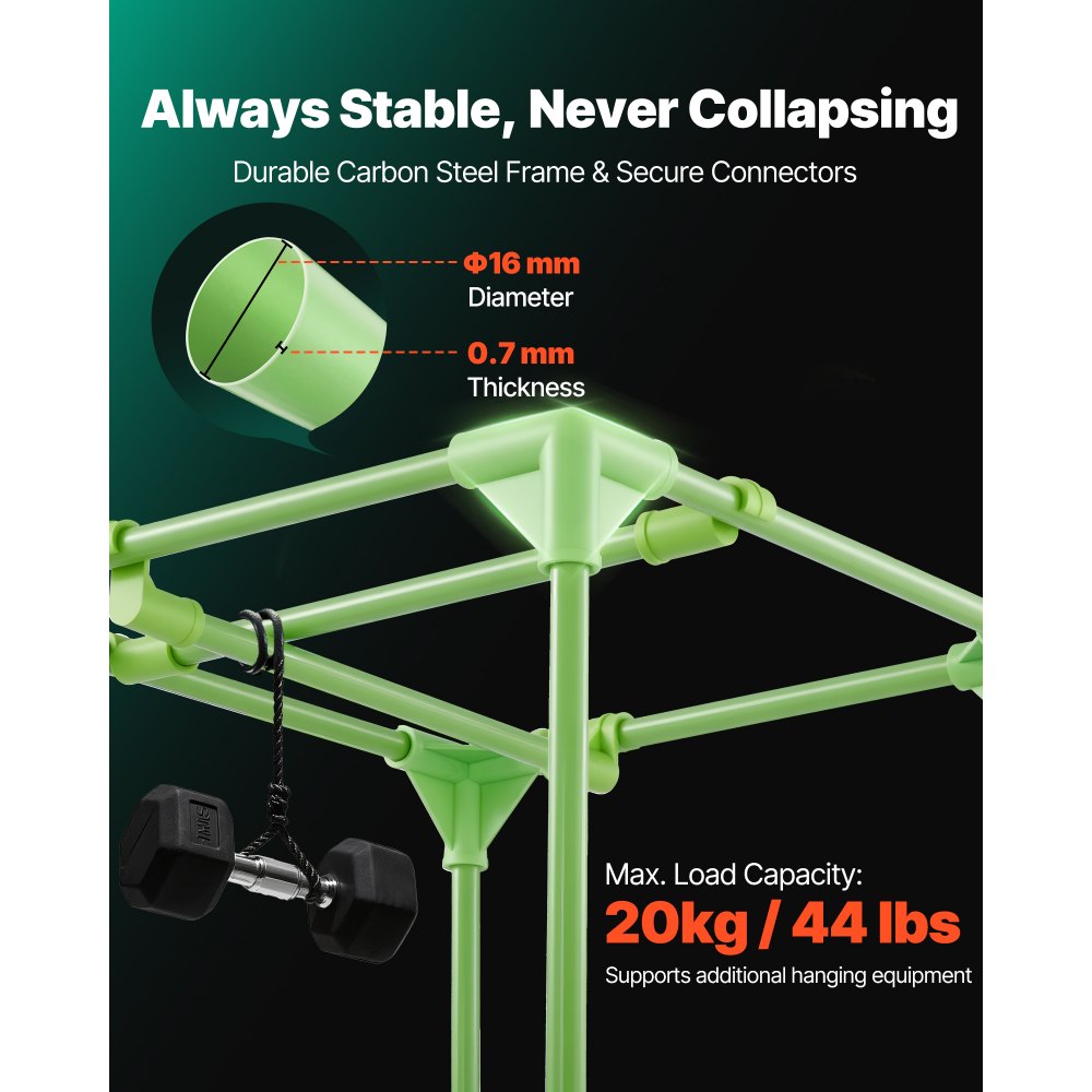 Stabilny i łatwy montaż: Wyposażony w solidną metalową ramę, ten namiot zapewnia solidne podparcie i zapobiega odkształceniom i zapadaniu się. Konstrukcja z blokadą i solidnymi łącznikami narożnymi umożliwia montaż bez użycia narzędzi. Maksymalne obciążenie 20 kg pozwala na montaż dodatkowego sprzętu w razie potrzeby.