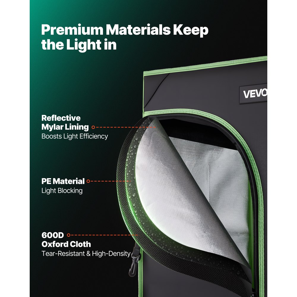 Wnętrze w 100% odblaskowe: Wnętrze wykonane jest z folii poliestrowej, która maksymalizuje odbicie światła i minimalizuje utratę ciepła, sprzyjając zdrowszemu wzrostowi roślin. Zewnętrzna warstwa wykonana jest z wytrzymałej tkaniny Oxford 600D, odpornej na rozdarcia i nieprzezroczystej. Podwójne, czarne zamki skutecznie uszczelniają wszelkie szczeliny.