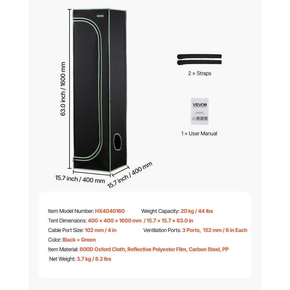 Namiot do uprawy VEVOR, 40x40x160 cm, namiot do uprawy Mylar 600D o wysokiej refleksyjności, namiot do roślin doniczkowych z oknem obserwacyjnym, tacką na podłoże i zamkiem błyskawicznym, namioty do uprawy owoców, kwiatów i warzyw w szklarniach