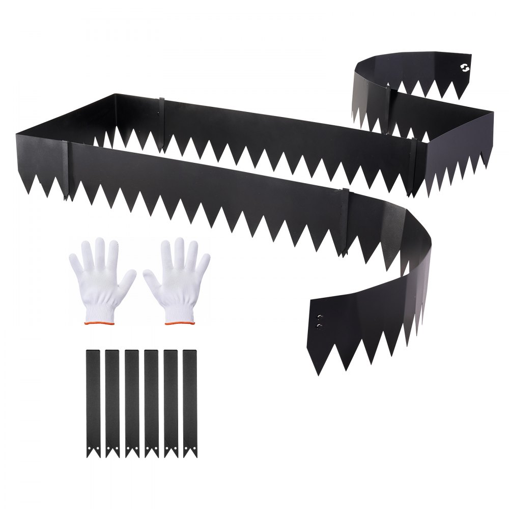 Kompletny zestaw, gotowy do użycia: Ten metalowy zestaw obrzeży ogrodowych zawiera 6 elementów obrzeża, 6 klipsów mocujących i 1 parę rękawic. Wydłużone kolce do wbijania w ziemię są łatwe wbijane w ziemię, co ułatwia i uprzyjemnia montaż.