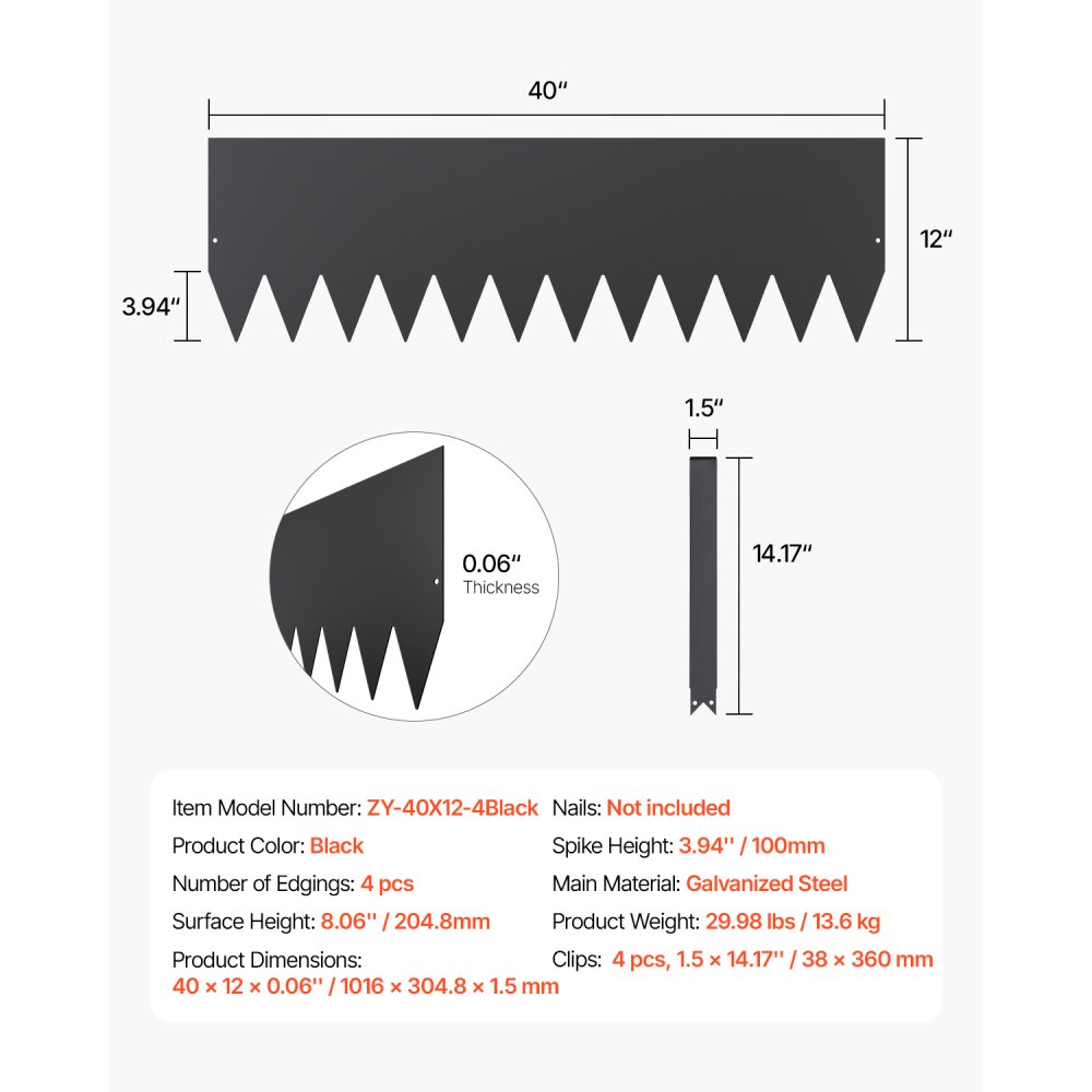 Obrzeże trawnikowe VEVOR, zestaw 4 szt., 1016 x 304,8 x 1,5 mm, metalowe, odporne na rdzę, obwódka rabat kwiatowych, obrzeże trawnikowe, łatwe w montażu, rozdzielacz do rabat kwiatowych, ścieżek ogrodowych, czarne